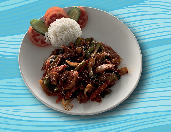 with rice, vegetables, and korean sauce / Κορεάτικο τηγανητό κοτόπουλο με ρύζι, λαχανικά και κορεάτικη σάλτσα / Жареная курица по-корейски с рисом, овощами и корейским соусом