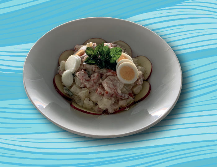 Salad with shrimps, eggs, apple, carrot,potatoes and vegetables