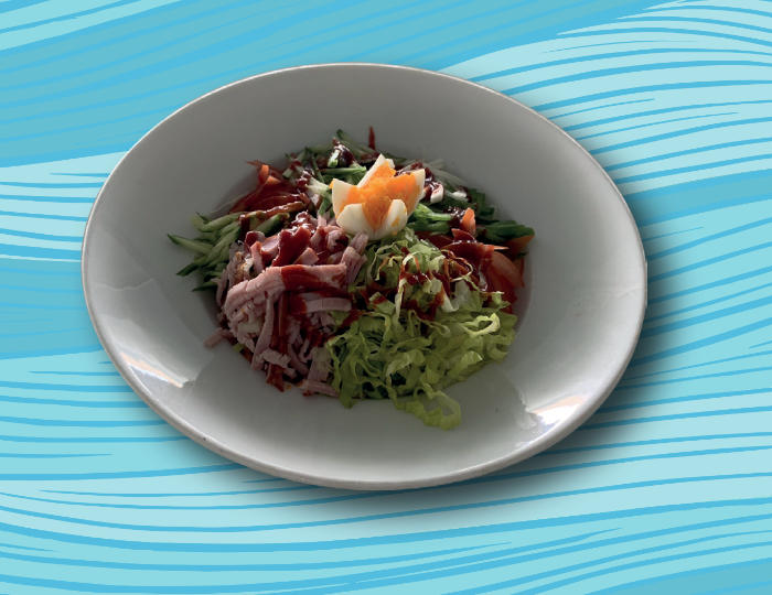 Spicy and sour mixed noodles with vegetables and lountza