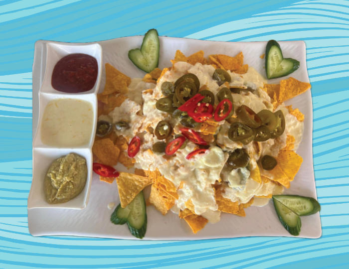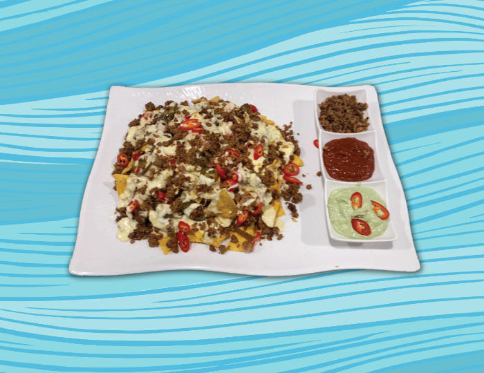 with beans and minced meat. / Μεξικάνικη πιατέλα nachos με φασόλια και κιμά. / Мексиканское блюдо начос с фасолью и фаршем.